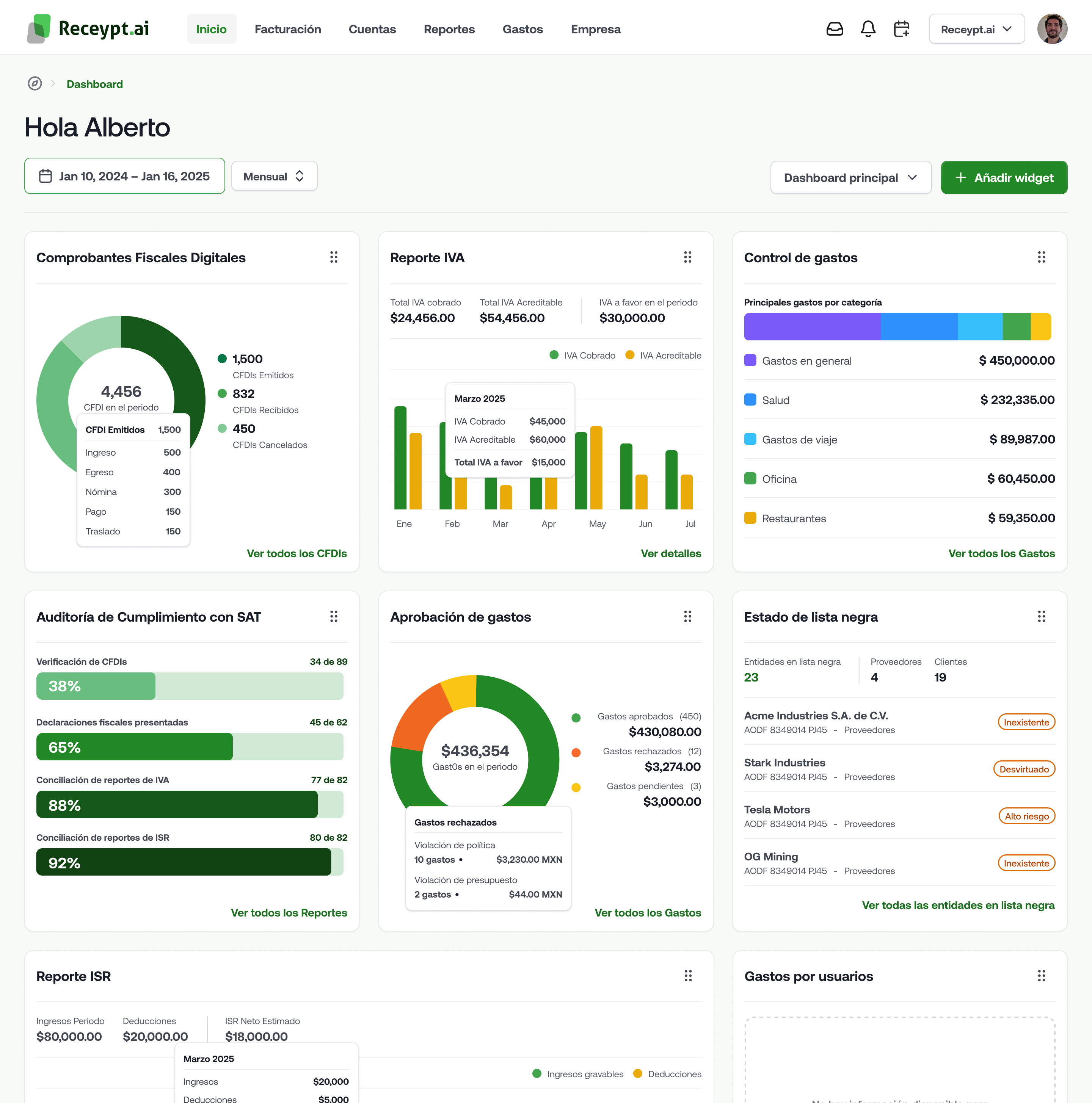 Dashboard con métricas clave (IVA por recuperar, saldos, estado financiero).